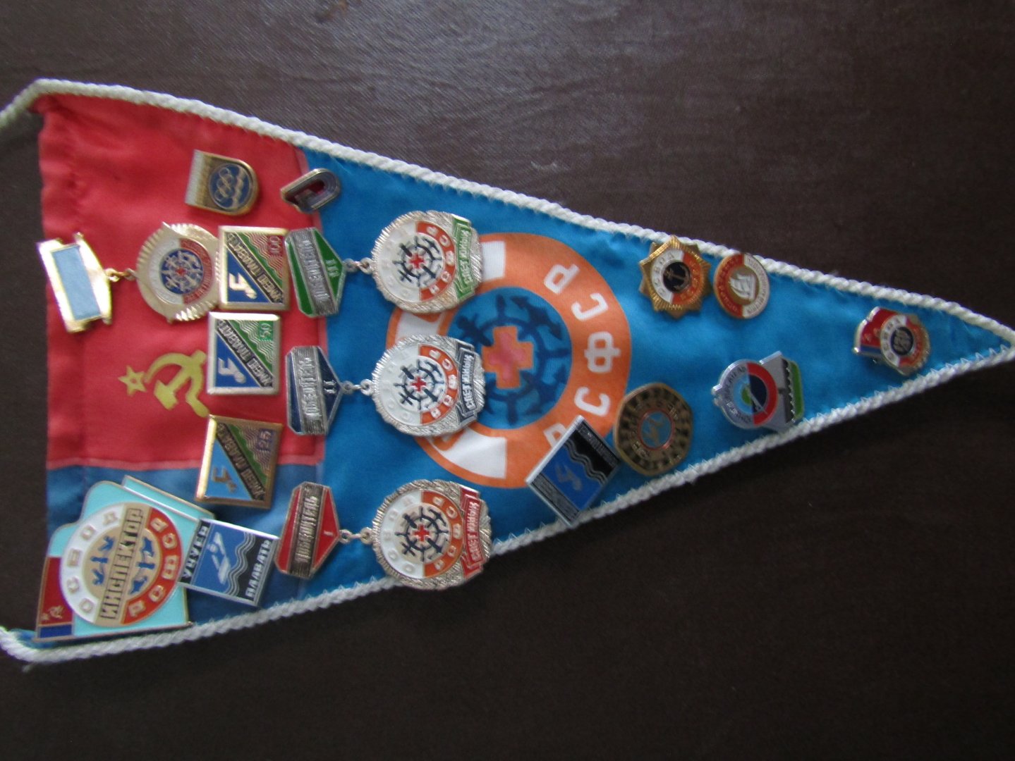 Работая с архивными документами, иногда с ностальгией вспоминаешь о гадах работы в организации ОСВОДа РСФСР, когда эти организации действовали во всех краевых, областных, республиканских (АССР), городах и областях Москвы и Ленинграда. (Конечно, до «лихих» 90-х). Одним из стимулов деятельности организаций, в том числе и ОСВОДа РСФСР, являлись (впрочем, как и в нынешнее время) ежегодные подведения итогов работы. В то время все организации ОСВОДа РСФСР были поделены на несколько групп, по принципу территориальной принадлежности, а также численности населения. Подведение итогов проводилось по каждой группе регионов отдельно, а победители и призеры данных конкурсов (в Советское время это называлось – соцсоревнованиями) в торжественной обстановке награждались знаменами, вымпелами, Почетными грамотами Центрального Совета ОСВОДа РСФСР, на очередном Пленуме ЦС. Мордовский республиканский Совет ОСВОДа РСФСР, начиная с 1984 года (в том году мы создали Школу и ГПТР ОСВОДа), в своей группе регионов всегда стал входить в число призеров этого конкурса. В нашей организации, например, сохранился вымпел за 2-е место по итогам работы за 1984 год. К сожалению, многих реликвий того времени не сохранилось, из-за того, что в «лихие» 90-е годы нашу базу на водоеме в г. Саранске разгромили «уличные братки», по той причине, что я, недавно избранный Председателем ОСВОДа, отказался от предлагаемой ихней «крыши»! И «расплата» последовала незамедлительно! Что из себя представляли в то время правоохранительные органы, видимо помнят те мои коллеги, работавшие тогда. Когда я прибыл утром на место «разгрома» и позвонил из соседнего Дворца пионеров в райотдел милиции (телефоны на нашей базе, естественно, тоже были разбиты, и даже телефонные провода были вырваны «с корнем»), то через некоторое время подъехала группа из трех человек (майор и двое в «гражданке»). Майор первым делом спросил: «Трупы есть?». Я ответил, что нет. Тогда он сказал – «С остальным разбирайтесь сами»! Вот такие были времена … Хотелось бы отметить еще, что в то время в составе ОСВОДа России работали различные хозрасчетные подразделения, выпускавшие разную печатную продукцию, множество различных значков, знамена, вымпела и т. д. Значки, например, выпускались огромными тиражами, поэтому стоимость их была мизерная, и доступна для всех организаций Общества. На фотографиях: наградная атрибутика в бытность ОСВОДа РСФСР. Евдокимов Валерий Павлович, Председатель Мордовского регионального отделения ВОСВОД. Член