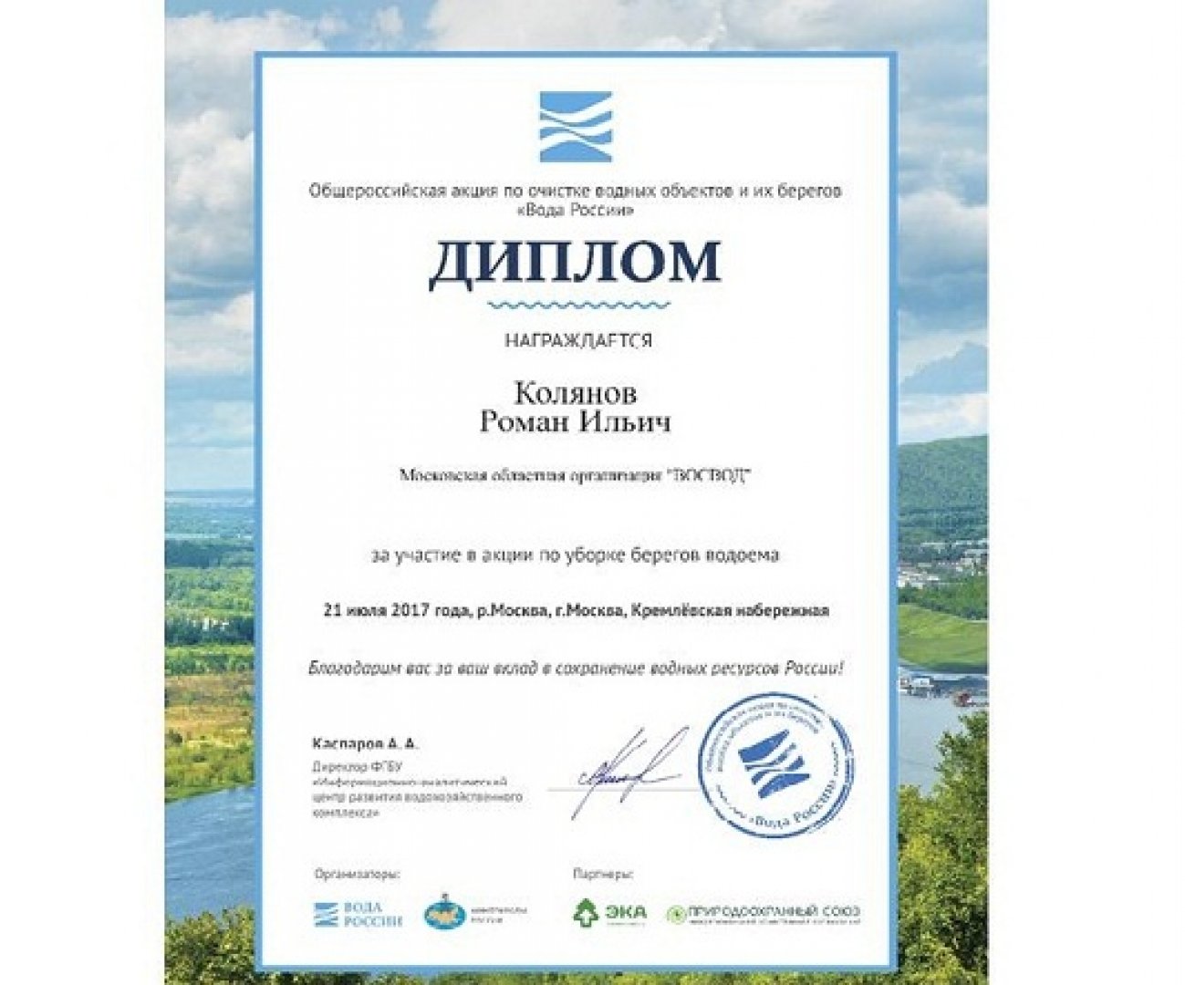 Совет Московской областной организации ВОСВОД поздравляет Колянова Романа Ильича - первого заместителя председателя Совета, руководителя исполнительного аппарата МОО ВОСВОД с вручением благодарственного диплома за участие в Общероссийской акции по очистке водных объектов и их берегов "Вода России".