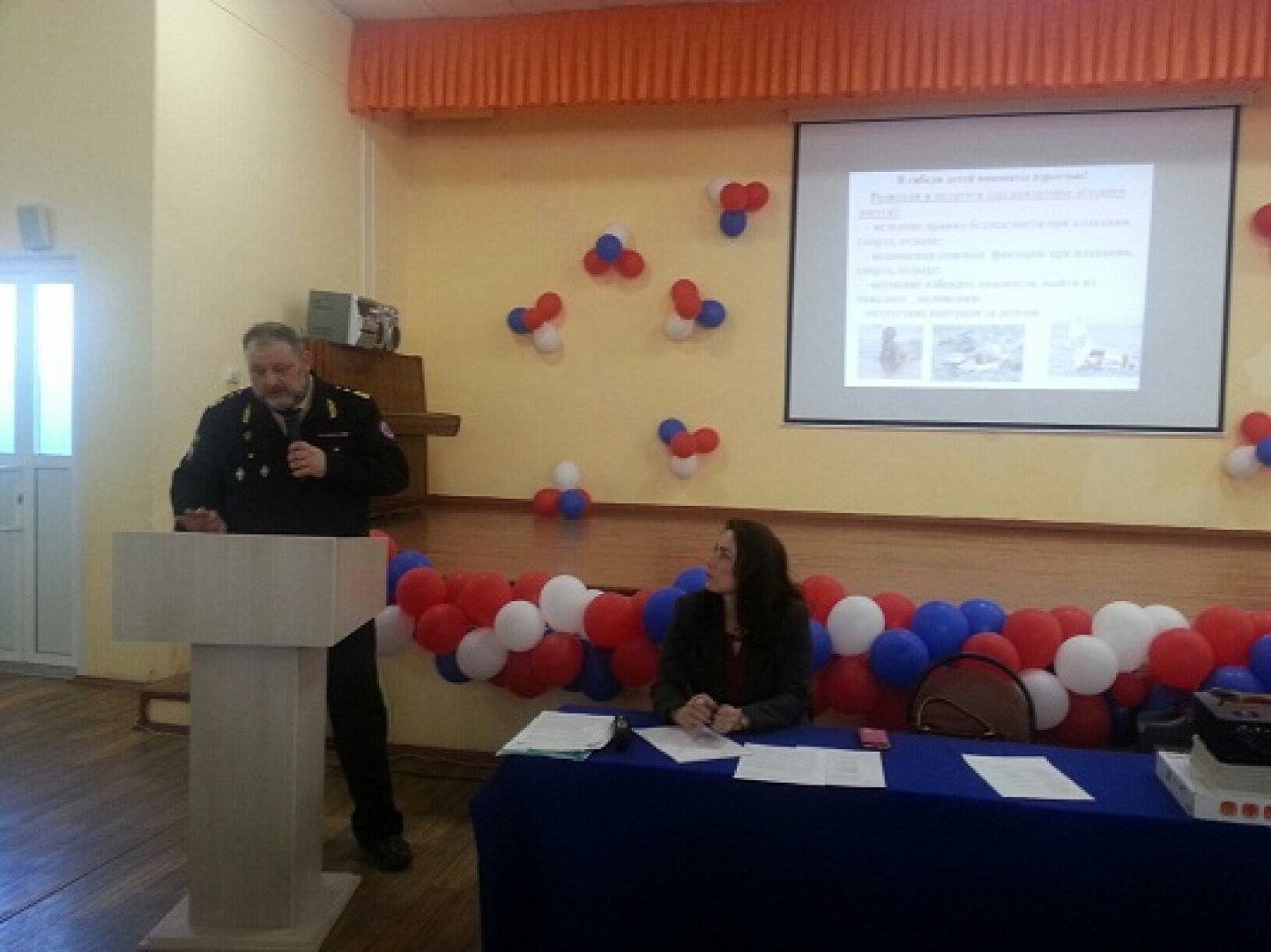 Перед аудиторией 120 начальников выступили: Зеленкевич Юрий врач по общей гигиене подростков отдела обеспечения санитарно-гигиенического надзора ФБУЗ «Центр гигиены и эпидемиологии в Удмуртской Республике», Малькова Вероника начальник ООДПДН МВД по УР, Черников Владимир председатель Центрального Совета Региональной общественной организации «Общество спасения на водах в Удмуртской Республике» Шишкин Сергей директор Центра коррекции стопы и осанки.
