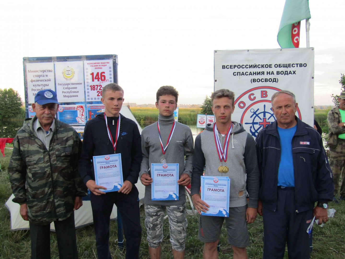 ВОСВОД Мордовии. «Зарница-18» выявила победителей. Как мы уже сообщали ранее, в рамках регионального этапа военно-спортивной игры «Зарница Поволжья-18», которая проходила в Ковылкинском муниципальном районе, Мордовское региональное отделение Всероссийского общества спасания на водах (ВОСВОД) проводило два вида многоборья: 1. Спасательное многоборье на воде, в программу которого входили соревнования по плаванию на дистанции 50 метров, с буксировкой спасательных кругов, гребле на лодках на дистанции 150 метров, с поворотом вокруг буев на середине дистанции, подаче «Спасательного конца Александрова» на дальность и точность, и викторина «Знатоки водно-спасательного дела». 2. Многоборье «Сильные и ловкие» (по поручению Министерства спорта и физической культуры Республики Мордовия), в программу которого входили соревнования по бегу на дистанции 60 метров, легкоатлетическому кроссу на дистанции 1500 метров, метанию гранаты, подтягиванию на перекладине (юноши), сгибанию и разгибанию рук в упоре «лежа» за 3 минуты (девушки). После каждого вида соревнований Председатель Мордовского регионального отделения ВОСВОД Евдокимов Валерий Павлович награждал победителей и призеров в «городке ВОСВОД», развернутом на берегу реки Мокша. Всего по итогам соревнований было вручено 48 медалей и 48 грамот за личные призовые мета, 6 дипломов за командные призовые места, а также 6 «Почетных грамот» - руководителям команд, подготовившим чемпионов и призеров в командном зачете до двум вышеупомянутым многоборьям. Необходимо отметить, что ежегодно на подобных соревнованиях выявляются особо отличившиеся спортсмены, которые завоевывают по нескольку медалей на различных видах программы. На фотографии: Слева – Евдокимов Валерий Павлович, справа – руководитель команды Инсарского муниципального района, старейший член республиканского Совета ВОСВОД Перфильев Николай Яковлевич. Рядом с ним – его ученик и воспитанник Михаил Краснорепов, завоевавший на прошедших соревнованиях две «золотые» и одну «серебряную» медали. Михаил победил в метании гранаты, с результатом 51,7 метра и подтягивании на перекладине (33 раза), а также занял второе место в легкоатлетическом кроссе. Пресс-служба Мордовского регионального отделения ВОСВОД