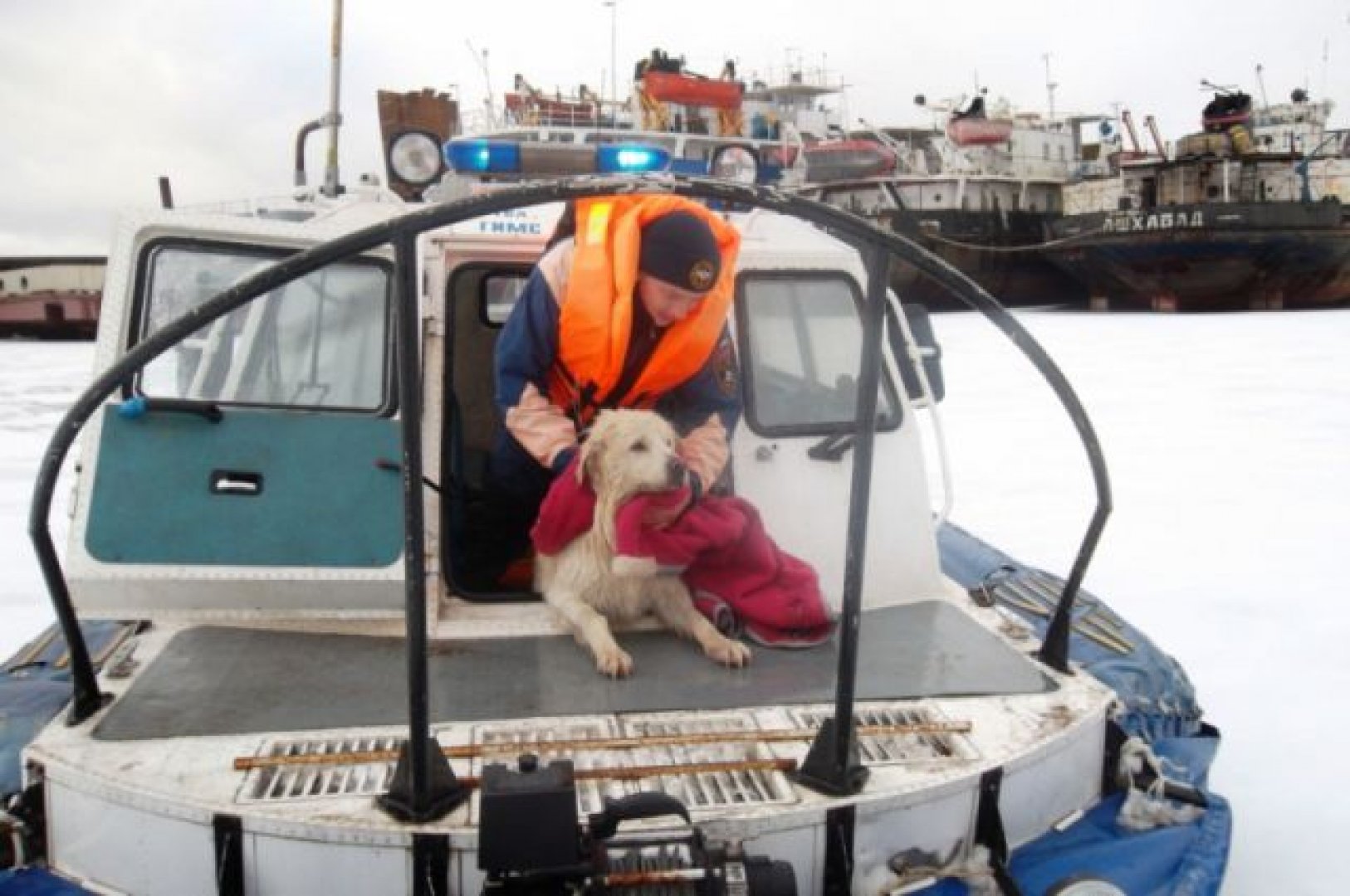 Патрульная группа инспекторского отделения Ярославля ГИМС ФКУ МЧС РФ в составе 2-х человек на катере на воздушной подушке Хивус-6 мгновенно выдвинулась на место происшествия. Правда, достать пса из ледяной воды было не так уж и просто.