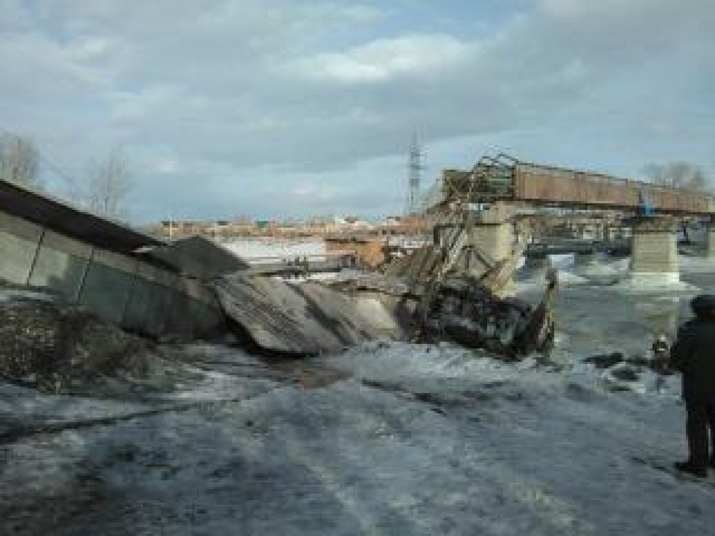 Этот мост в Минусинске соединяет новую и старую части города. На мосту находился кран, который укладывал новые плиты. Вероятно, не выдержав веса техники, один пролет моста рухнул. Кран упал на насыпь под мост. В результате ЧП госпитализирован крановщик. Он находится в тяжелом состоянии. Кроме него, есть еще трое пострадавших.