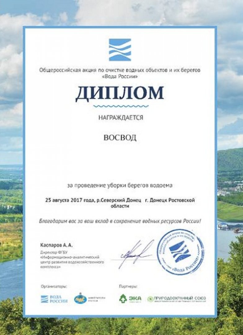 Донецкая организация ВОСВОД получили от Минприроды РФ диплом за участие в федеральной целевой программе Вода России. ВОСВОД города Донецка 25 августа участвовал в конкурсе Вода России. В конкурсе участвовало 19 членов ВОСВОД убрано 1.5 километра берега от мусора.