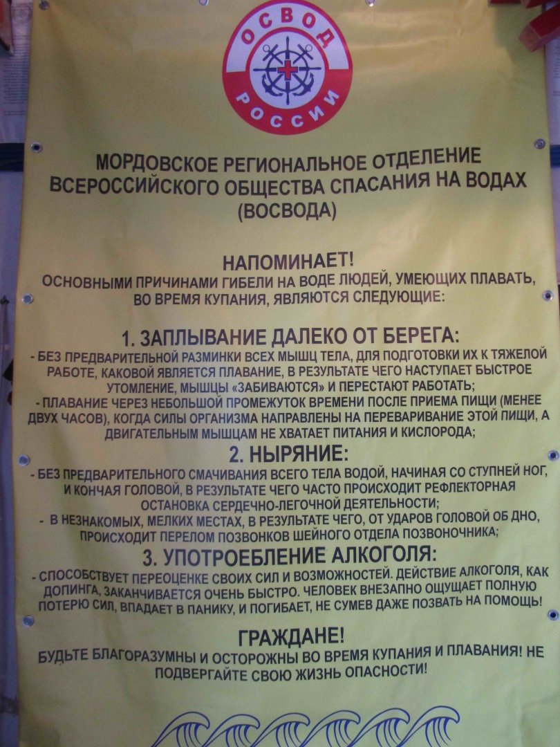 Начиная с советских времен, бытует мнение, что основной причиной гибели людей на воде, не считая пьянства, является неумение плавать. К сожалению, такое мнение поддерживается и в некоторых печатных материалах ВОСВОД. Такое утверждение, мягко говоря, не только не верно, но и даже вредно! Говоря о том, что причиной гибели людей на воде, является неумение плавать, мы тем самым убеждаем их, что умение плавать – залог их безопасности на воде во время купания! Поэтому, можно часто слышать от отдыхающих, нарушающих правила купания, что они никогда не утонут, потому, что умеют плавать! К сожалению, как показывает статистика, в реальности на воде при купании погибают, в большинстве своем, люди, которые умеют плавать! За исключением малолетних детей, оставленных без присмотра взрослых. Не умеющий плавать человек, даже в нетрезвом состоянии, в воду не полезет! При анализе несчастных случаев с людьми на воде выясняется, что причинами их гибели, в основном, являются грубые нарушения самых элементарных правил безопасного купания. Перечислим некоторые из них: 1. Заплывание далеко от берега: - без предварительной разминки всех двигательных мышц тела для подготовки их к тяжелой работе, каковой является плавание, в результате чего наступает быстрое утомление, мышцы «забиваются» и перестают работать; - Плавание через небольшой промежуток времени после приема пищи (менее двух часов), когда силы организма направлены на ее переваривание, а двигательным мышцам не хватает питания. 2. Ныряние в воду: - без предварительного смачивания всего тела водой, начиная со ступней ног, и кончая головой, в результате чего, часто происходит рефлекторная остановка сердечно-легочной деятельности; - в незнакомых, мелких местах, в результате чего, от ударов головой обо дно, происходят переломы в шейном отделе позвоночника. 3. Употребление алкоголя: - способствует переоценке своих сил и возможностей, «толкает» людей на совершение грубых нарушений правил безопасного купания. Недаром, в народе говорят, что «Пьяному, море по - колено!» Поэтому, одним из направление деятельности Мордовского регионального отделения Всероссийского общества спасания на водах (ВОСВОД) является пропаганда правил безопасного купания среди населения, самыми различными методами и способами. К ним относятся, например, баннеры с соответствующей информацией, устанавливаемые на пляжах, пластиковые пакеты (на одной стороне которых изображена эмблема ВОСВОД, а на другой – вышеприведенная информация о причинах гибели на воде людей, умеющих плавать), которые вручаются победителям и призерам многочисленных соревнований, проводимых в течение всего года ВОСВОД Мордовии. На фотографии: Баннер с информацией о причинах гибели людей, УМЕЮЩИХ ПЛАВАТЬ. Пресс-служба Мордовского регионального отделения ВОСВОД