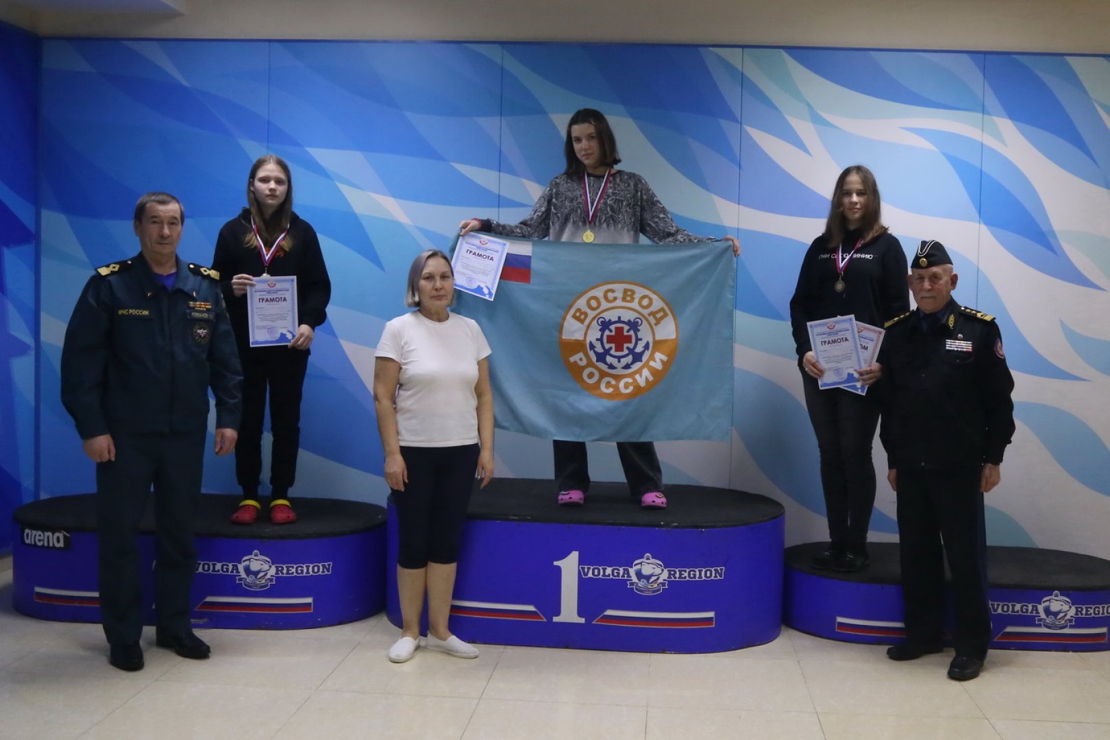 27 декабря в России отмечался очередной праздник – День спасателя. Как и ежегодно, Мордовское региональное отделение Всероссийского общества спасания на водах (ВОСВОД) совместно с Управлением по развитию физической культуры, спортивной инфраструктуры и молодежной политики Администрации городского округа Саранск, и при поддержке Центра ГИМС ГУ МЧС РФ по Республике Мордовия, отметили этот праздник соревнованиями на воде. Только в этом году соревнования прошли в несколько другом формате, и к традиционным организаторам присоединились региональные отделения Всероссийских Федераций - подводного спорта, а также водно-спасательного многоборья. В программу вошли традиционные соревнования по плаванию на дистанции 50 метров с буксировкой спасательных кругов, а также (впервые) смешанная (2+2) эстафета по плаванию 4 х 50 метров в ластах. В соревнованиях приняли участие воспитанники тренеров по подводному спорту - Потапова Игоря, Видяскиной Татьяны, Рашевской Дарьи и Авдониной Софьи – учащиеся из школ №№ 3,5, 9, 17, 24, 33, 38, 39, гимназий №№ 12, 19, 20, 23, лицеев №№ 4, 7, 26 и 43, Луховского, Центра одаренных детей и др. Борьба на голубых дорожках бассейна была очень упорной. Достаточно сказать, что в эстафете по плаванию 4 х 50 метров в ластах команда «Дельфин «Старт» (тренер Игорь Потапов, член Совета ВОСВОД республики) в составе мастеров спорта по подводному спорту - Екатеринина Кирилла (лицей № 26), Ермолаева Ильи (школа № 3), Заводуновой Анастасии (лицей № 4), Кожуриной Маргариты (гимназия № 23), занявшая 1-е место и показавшая результат 1 мин. 42, 37 сек., всего на 2 сотых долей секунды (!) опередила команду «Фокс-13» (тренер Авдонина Софья). А команда «Акванавт-1» (тренер Видяскина Татьяна, член Совета ВОСВОД республики) всего на полторы секунды отстала от второго призера! В соревнованиях по плаванию на дистанции 50 метров с буксировкой спасательных кругов личные призовые места распределились следующим образом: Девушки: 1 место – мастер спорта Кожурина Маргарита из гимназии № 23 (57,61 сек.). 2 место – Чернявская Анна из школы № 9 (59,69 сек.). Тренер обеих спортсменок – Игорь Потапов. 3 место – Перова Софья из школы № 24 (1 мин. 03,72 сек.). Тренер – Татьяна Видяскина. Юноши: 1 место – мастер спорта Сенькин Кирилл из школы № 17 (49,91 сек.). Тренер – Татьяна Видяскина. 2 место – Казаков Валерий из кооперативного института (50,92 сек.). Тренер Игорь Потапов. 3 место – Станислав Николаев из техникума электронных технологий (50,92 сек.). Тренер Софья Авдонина. В процессе соревнований были определены также лучшие команды по плаванию с буксировкой спасательных кругов в разрезе школ города. Лучший результат показали учащиеся школы № 38. На втором месте – учащиеся школы № 17, и на третьем – лицея № 7. Победителя и призеры, как в личном, так и в командном зачете, награждены, соответственно, Дипломами и кубками, медалями и грамотами от организаторов соревнований. На фотографиях: 1.Победители и призеры соревнований в эстафете. Награждение провели: Валерий Евдокимов (слева), Татьяна Видяскина (в центре), Александр Романов (справа). 2. Старт очередного заплыва в ластах. 3. Буксировка спасательных кругов. 4. Победители и призеры – девушки. Пресс-служба Мордовского регионального отделения ВОСВОД