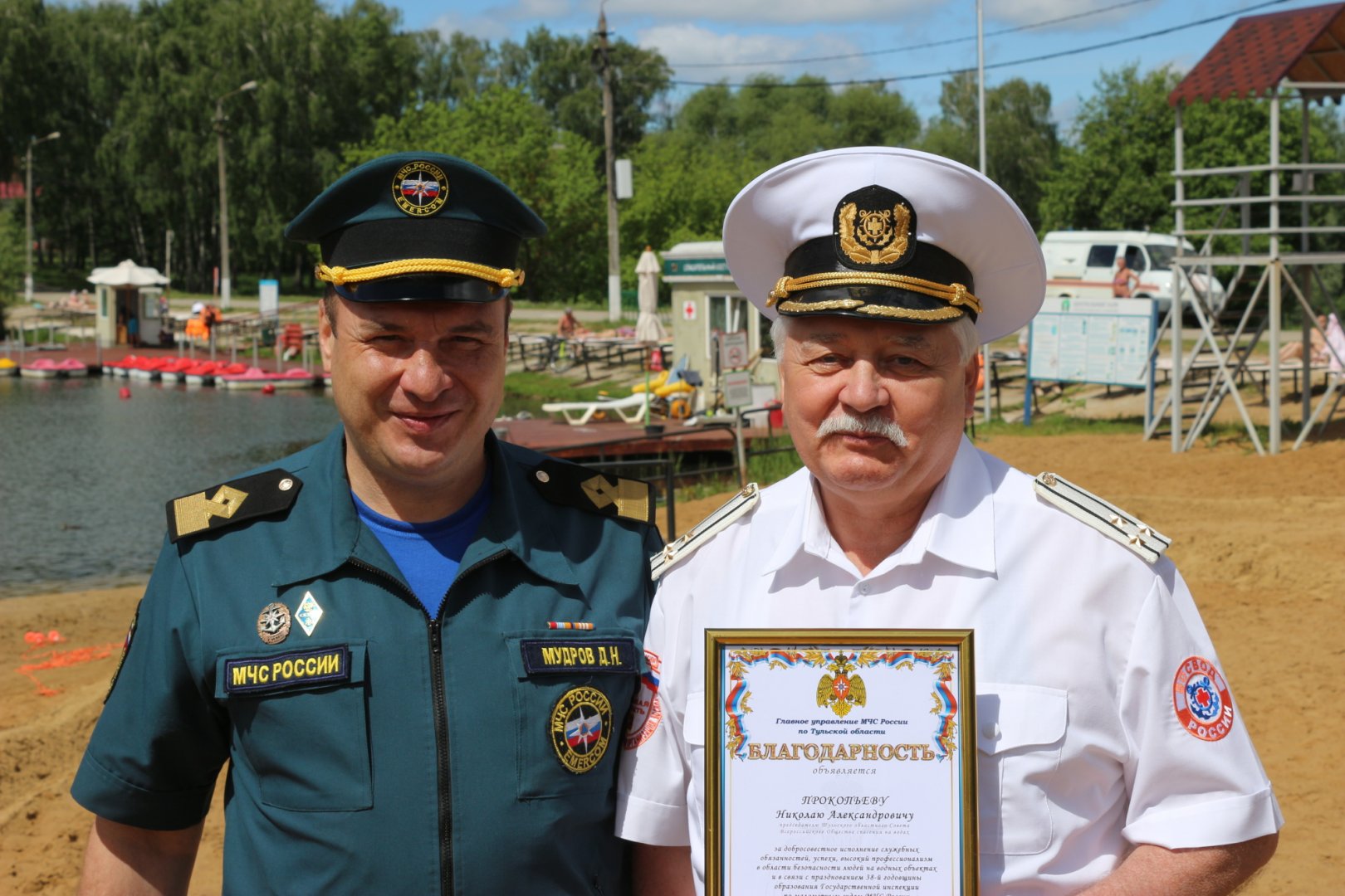 В Центральном парке культуры и отдыха им. П.П. Белоусова города Тулы состоялось торжественное мероприятие в честь открытия купального сезона в регионе, приуроченное к 38-годовщине образования государственной инспекции по маломерным судам. Сначала состоялась торжественная часть мероприятия. Начальник отдела безопасности людей на водных объектах регионального спасательного ведомства Дмитрий Мудров, поприветствовал всех участников мероприятия, напомнил о праздновании в этом году крупной Юбилейной даты — 150 - летия Всероссийскому Обществу спасания на водах и вручил благодарности Главного управления начальнику Центра ГИМС МЧС России по Тульской области – члену Тульского Совета ВОСВОД Владимиру Лапшову, председателю Тульского областного Совета ВОСВОД Николаю Прокопьеву, а также другим сотрудникам Центра ГИМС МЧС России по Тульской области. Далее сотрудники МЧС организовали работу интерактивных площадок для обучения граждан правилам безопасного поведения на водных объектах. Спасатели продемонстрировали водолазное снаряжение, показали, как правильно нужно бросать спасательный круг и использовать спасательный конец Александрова, а также научили оказывать первую помощь человеку. После краткого инструктажа о правилах безопасного купания все желающие смогли попробовать самостоятельно применить изученные навыки на практике. В завершении праздника был дан обратный отсчет времени, а волонтеры и гости мероприятия отметили открытие купального сезона совместным прыжком в воду. Председатель областного Совета Николай Прокопьев