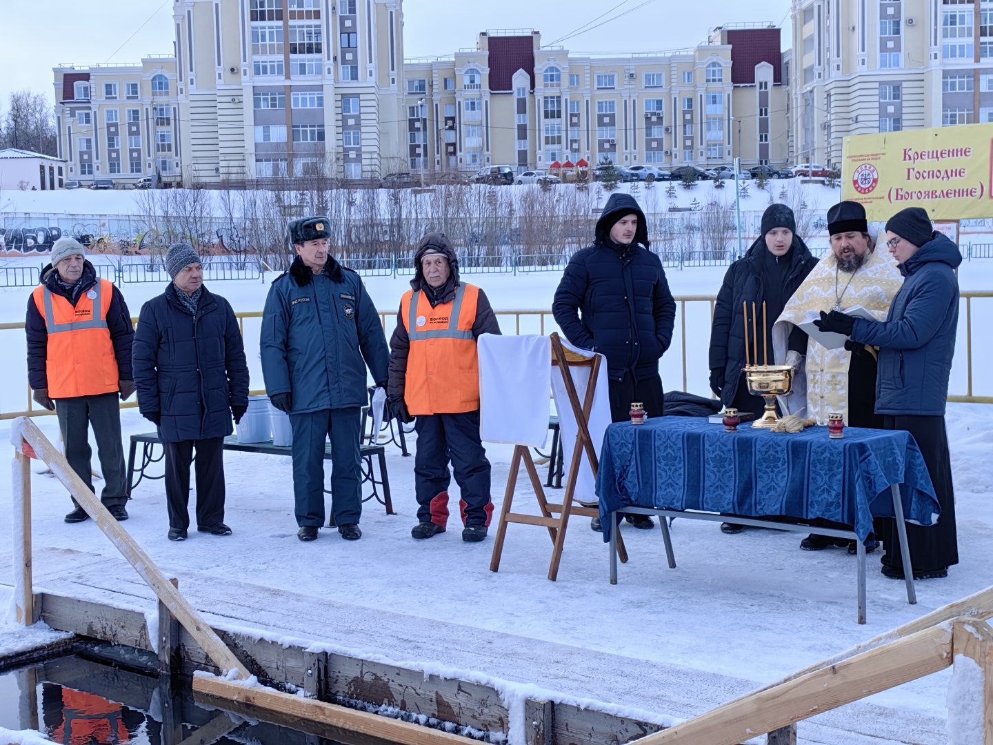 Как и планировалось Мордовским региональным отделением Всероссийского общества спасания на водах (ВОСВОД), чин освящения воды в купели на водоеме у стадиона «Старт» в г. Саранске и водосвятный молебен, совершил протоиерей о. Павел (Горбунов) – Первый проректор Саранской духовной семинарии, со своими учениками – семинаристами. На данном мероприятии, как и ежегодно, присутствовали: Председатель ВОСВОД Мордовии Евдокимов Валерий Павлович, инспектор Центра ГИМС ГУ МЧС РФ по Республике Мордовия, член Президиума Совета Общества Романов Александр Викторович, а также активисты ВОСВОД. Сразу-же, после освящения воды, началось «Крещенское купание». Как это происходило, мы расскажем в следующей информации. На фотографии: водосвятный молебен. Пресс-служба Мордовского регионального отделения ВОСВОД