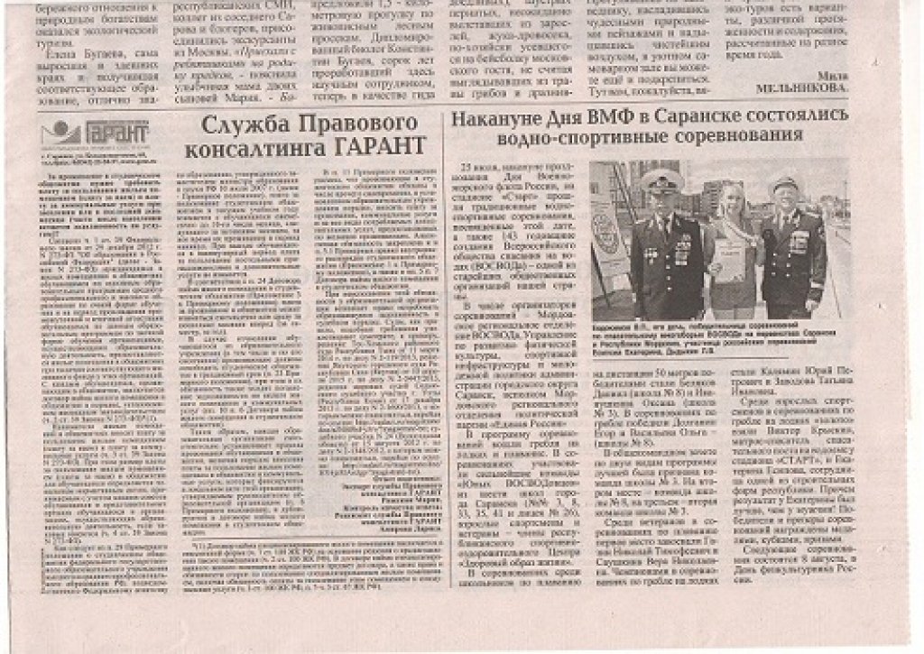 Так в номере газеты за 29 июля, вышедшей тиражом 14500 экземпляров, в рубрике Пресс-Тур, помещен материал под названием «Накануне Дня ВМФ в Саранске состоялись водноспортивные соревнования», с фотографией, на которой изображены Председатель Мордовского регионального отделения, член Президиума Центрального Совета, генерал-майор водно-спасательной службы ВОСВОДа, Евдокимов Валерий Павлович, его дочь Екатерина (по мужу-Есипова), ставшая чемпионкой соревнований по гребле на лодках среди женщин, и капитан 1 ранга, бывший командир АПЛ Дыдыкин Леонид Владимирович, во время церемонии награждения.