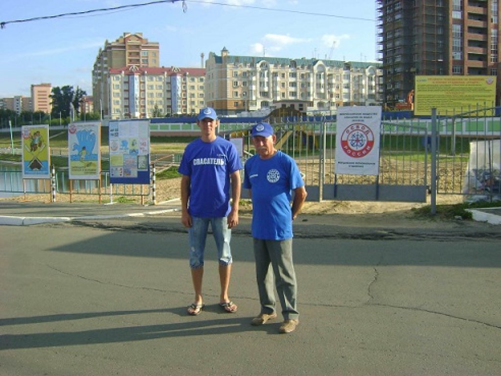На фотографии: Председатель ВОСВОДа Мордовии Евдокимов В.П. с одним из «Матросов-спасателей» спасательного поста на водоеме стадиона «Старт» - Олегом Рогулевым, на фоне стендов ВОСВОДа у входа на пляж.