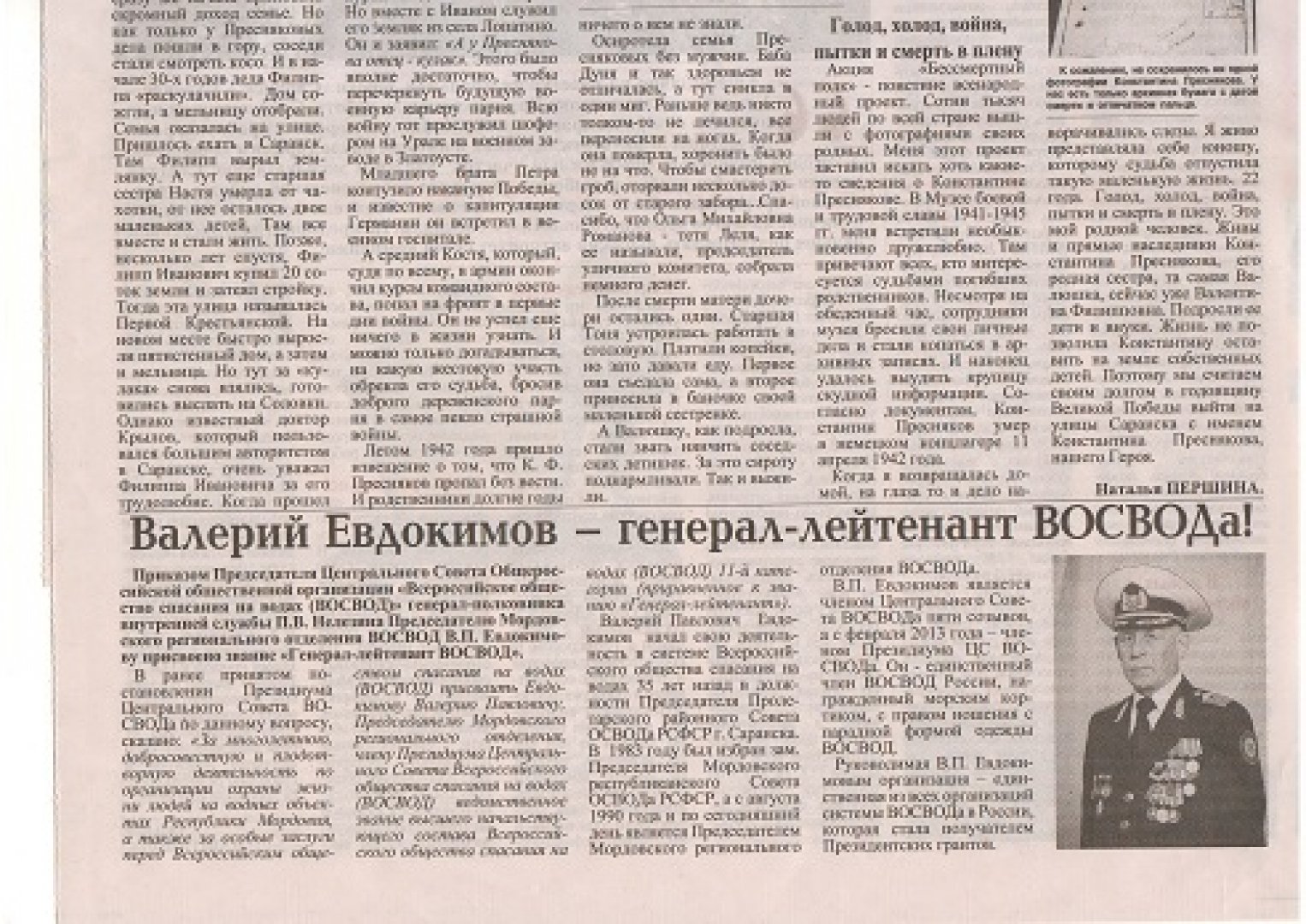 Не стала исключением информация о присвоении Председателю регионального отделения ВОСВОДа Евдокимову Валерию Павловичу звания «Генерал-лейтенант ВОСВОД», которая была опубликована в центральной газете нашей республики «Известия Мордовии» за 09 декабря 2015 года, под названием «Валерий Евдокимов – генерал-лейтенант ВОСВОДа!»