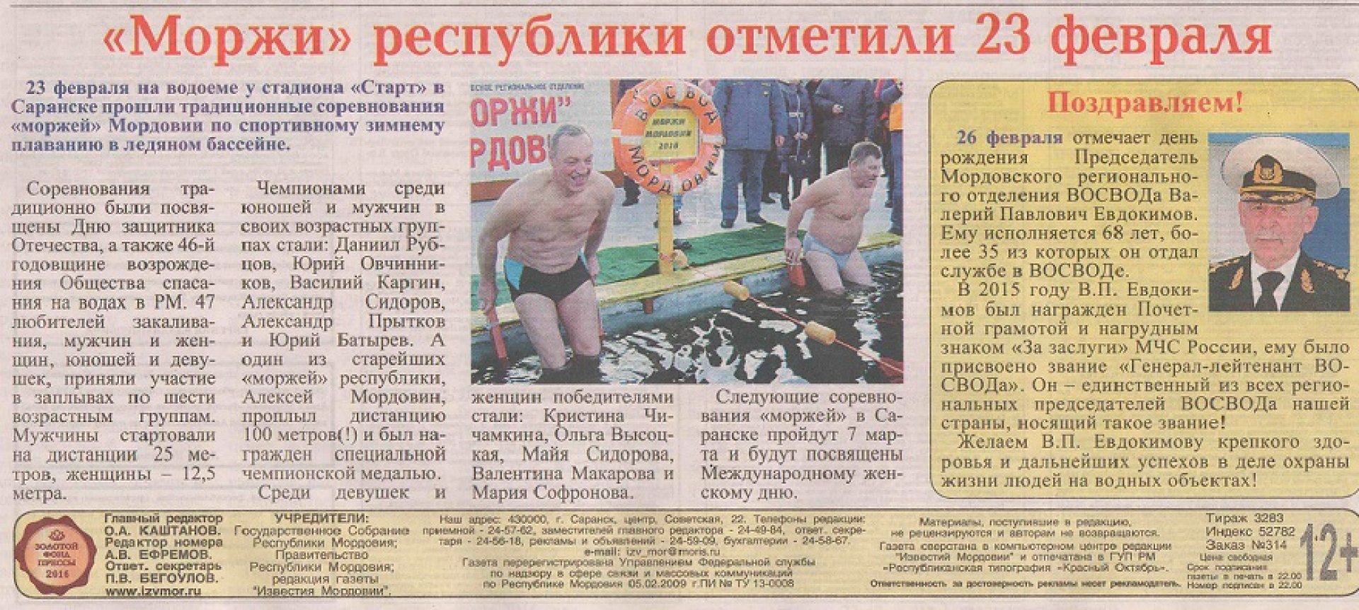 Рядом с этим материалом помещено «Поздравление» редакции газеты в адрес Евдокимова Валерия Павловича, которому 26 февраля (в день выхода данного номера газеты) исполнилось 68 лет, более 35 из которых он отдал службе в ВОСВОДе (в том числе – более 25 лет в должности Председателя Мордовского регионального отделения Общества)!