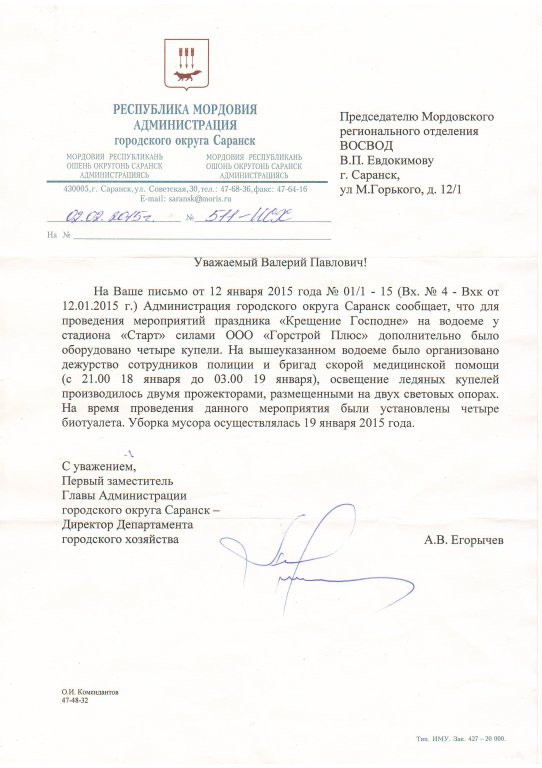 Кроме того, Администрация города, после проведения «Крещения» письменно информирует ВОСВОД об исполнении всех мероприятий, с предложениями о которых ВОСВОД обращался в Администрацию города.