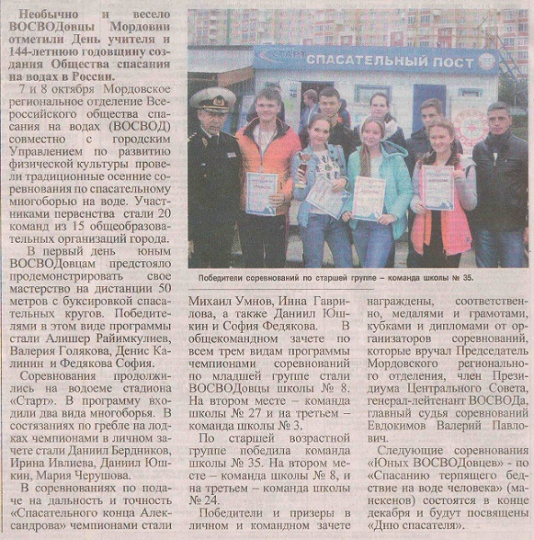 Так, в номере газеты за 11 октября 2016 года, на восьмой полосе в рубрике «Спорт» напечатан материал «Юные ВОСВОДовцы определили лучших», в котором рассказывается о соревнованиях по спасательному многоборью на воде среди «Юных ВОСВОДовцев» общеобразовательных организаций городского округа Саранск, посвященных Дню учителя и 144-й годовщине создания Общества спасания на водах в нашей стране. Вместе с материалом напечатаны две фотографии (одна из них – прилагается). Приводим дословно текст данной публикации: