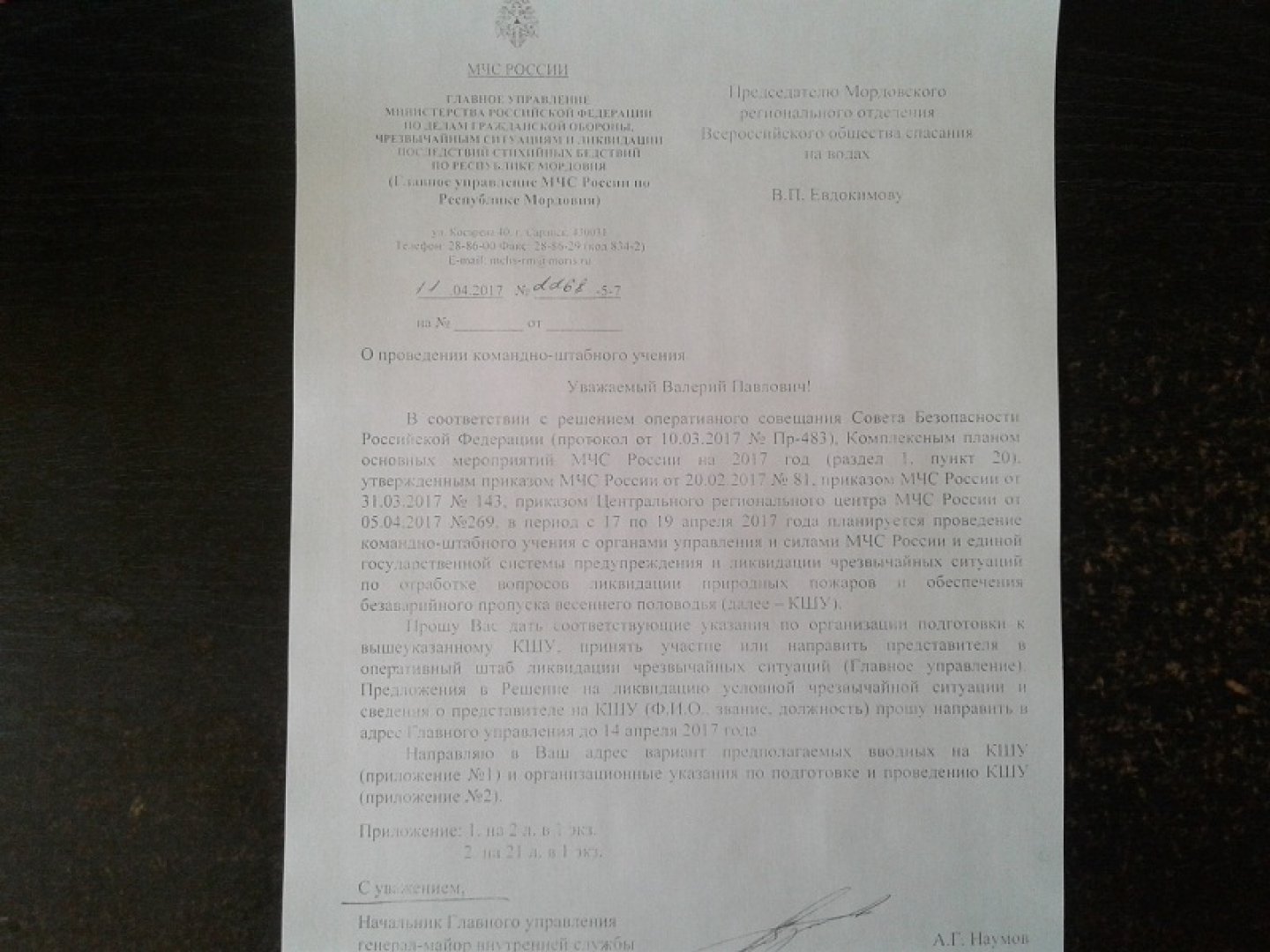Начальник Главного управления МЧС России по республике Мордовия, генерал-майор внутренней службы Наумов Андрей Геннадьевич, в соответствии с данными документами, направил соответствующее письмо в адрес Председателя Мордовского регионального отделения Всероссийского общества спасания на водах Евдокимова Валерия Павловича, с просьбой принять участие в командно-штабных учениях и представить предложения в Решение на ликвидацию условной чрезвычайной ситуации (на воде) в адрес Главного управления до 14 апреля 2017 года.