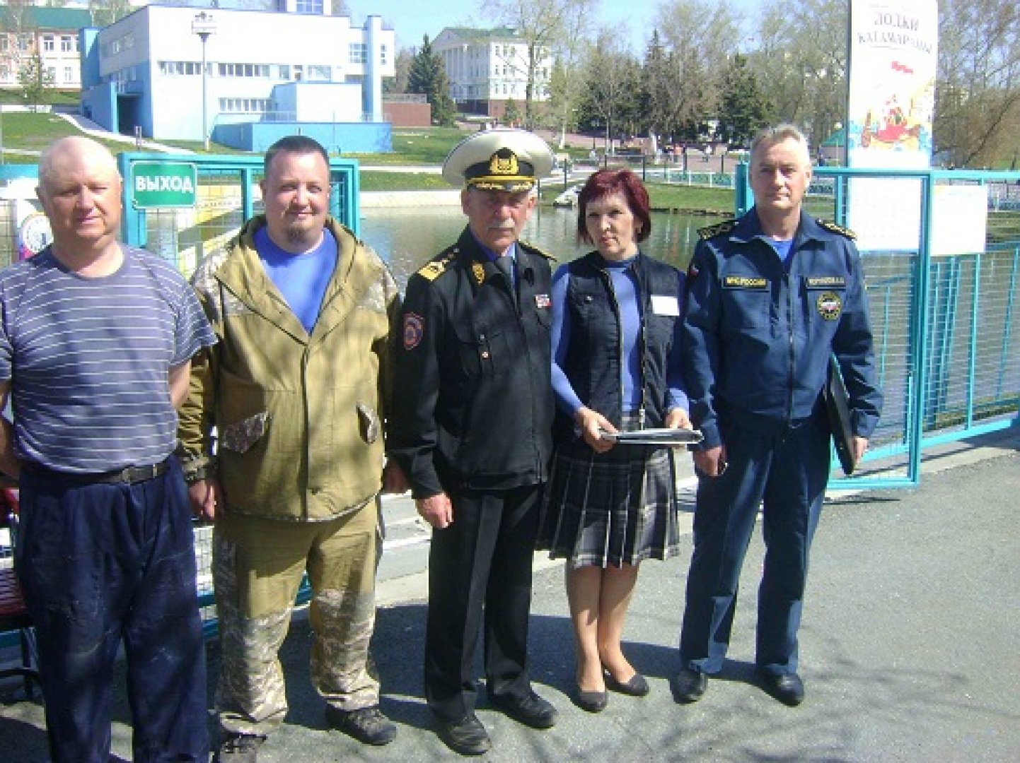 На фотографии: Евдокимов В.П. и Корнилов В.В. вместе с «Матросами-спасателями» и представительницей администрации парка им. А.С. Пушкина на пункте проката во время приемки объекта.