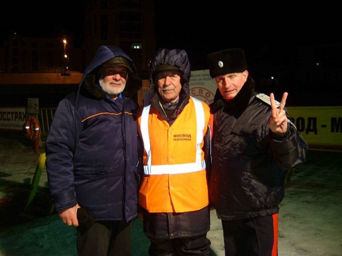 На фотографии: Евдокимов Валерий с помощниками: слева – член республиканского Совета ВОСВОД, один из старейших «моржей» Мордовии, сотрудник Дворца Детского творчества Евгений Колмогорцев. Справа – казак Свято-Предтеченской казачьей организации города Саранска Сергей Макаров.