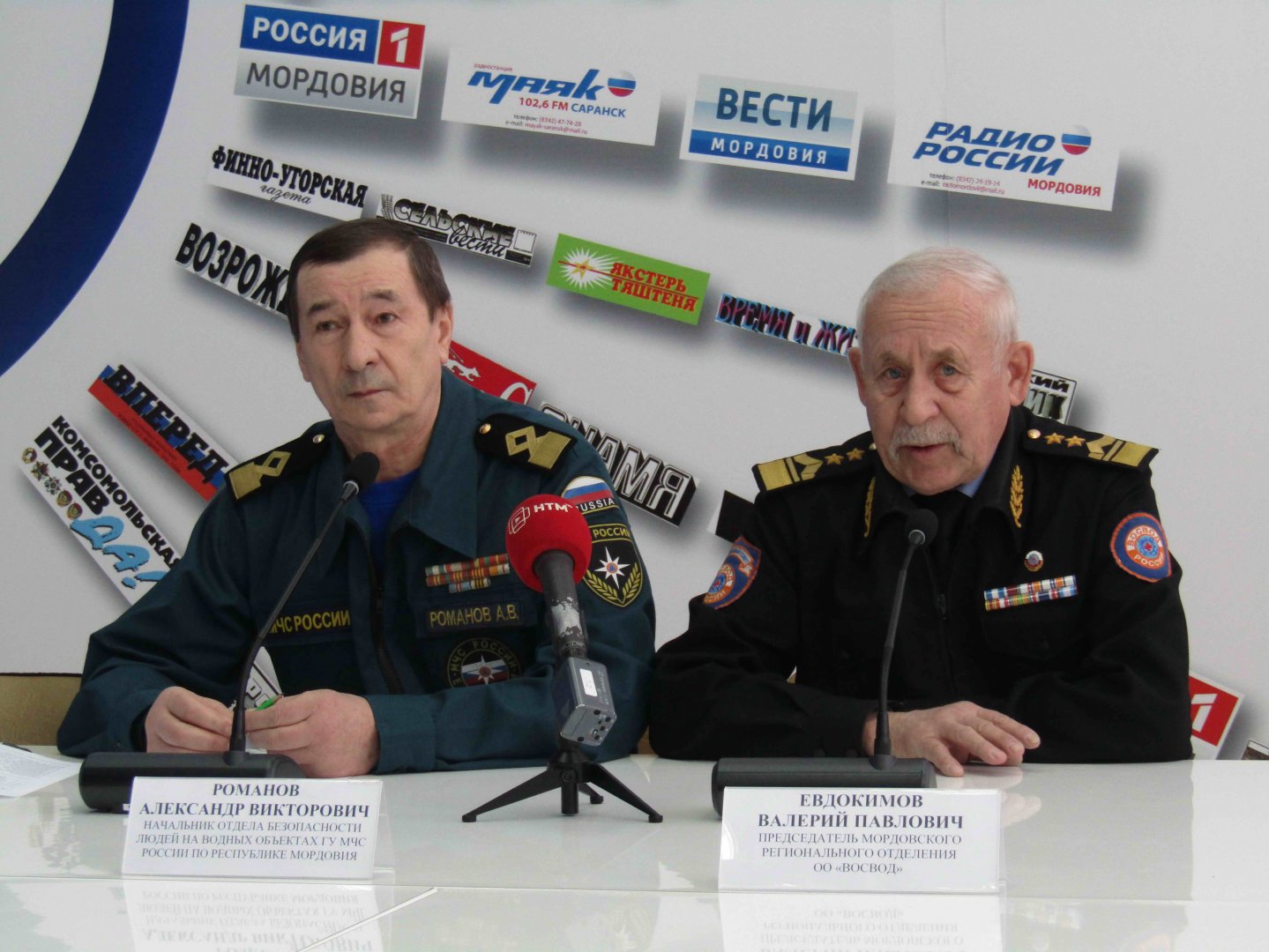 Председатель Мордовского регионального отделения Всероссийского общества спасания на водах (ВОСВОД) Евдокимов Валерий Павлович и Начальник Отдела «БВО» ГУ МЧС РФ по Республике Мордовия Романов Александр Викторович, по поручению руководства Республики Мордовия, 14 февраля 2019 года провели в пресс-центре Республики Мордовия пресс-конференцию (брифинг) для представителей печатных и электронных средств массовой информации республики. Тема пресс-конференции: подготовка к проведению предупредительно-профилактических и спасательных мероприятий в период приближающегося весеннего паводка и ледохода. Пресс-конференция продолжалась в течение часа. Евдокимов В.П. и Романов А.В. в своих выступлениях подробно рассказали о готовящихся мероприятиях и ответили на вопросы журналистов. Весенний паводок ожидается, как и ежегодно, в первой декаде апреля (ориентировочно). На фотографии: Романов А.В. и Евдокимов В.П. Пресс-служба Мордовского регионального отделения ОСВОД