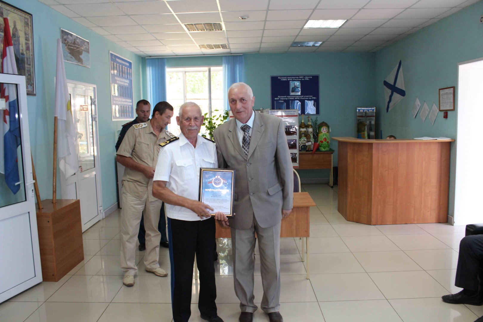 В Республике Мордовия, как и в других регионах страны, отметили 35-летие создания Государственной инспекции по маломерным судам (ГИМС). На торжественное мероприятие по этому случаю были приглашены ветераны ГИМС, ответственные работники ГУ МЧС РФ по Республике Мордовия, инспектора ГИМС из муниципальных районов, ФКУ ГИМС и представители других организаций, принимающих участие в совместной с ГИМС работе по охране жизни людей на воде в республике. Мероприятие прошло несколько позже официальной даты создания ГИМС, так как июнь месяц – самая напряженная пора работы для всех сотрудников данной организации. В числе приглашенных был также Председатель Мордовского регионального отделения Всероссийского общества спасания на водах (ВОСВОД) Евдокимов Валерий Павлович, который рассказал присутствующим о том, когда предшественница нынешней ГИМС – навигационно-техническая инспекция (НТИ), до 1984 года была в составе ОСВОДа РСФСР. Сам Валерий Павлович хорошо помнит те времена, так как начал работу в ОСВОДе Мордовии с 1980 года, а в момент преобразования НТИ в ГИМС был уже заместителем Председателя Мордовского республиканского Совета ОСВОДа РСФСР. Многим работникам ГИМС, ветеранам данной организации, были вручены «Почетные Грамоты», «Благодарности» ГУ МЧС РФ по Республике Мордовия. Очередной «Почетной грамотой» был награжден и Евдокимов В.П., которую вручил ему заместитель руководителя гражданской обороны республики Стуков Владимир Алексеевич, с которым они участвовали в проведении многих совместных мероприятий на протяжении более 30 лет! На фотографии: Стуков В.А. и Евдокимов В.П. Пресс-служба Мордовского регионального отделения ВОСВОД