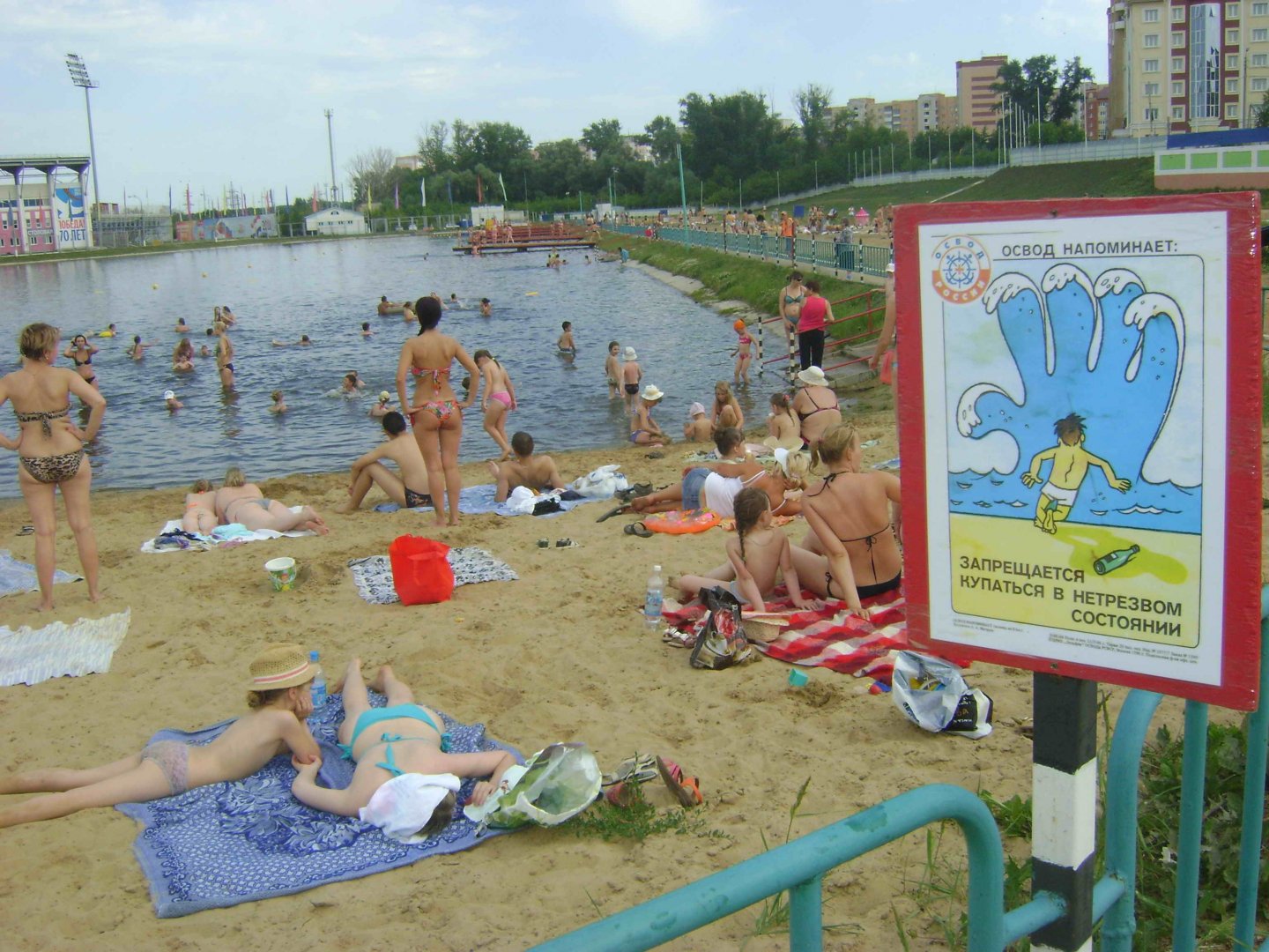 Казалось-бы, какое отношение имеет Мордовское региональное отделение Всероссийского общества спасания на водах (ВОСВОД) к … футболу? Оказывается, имеет, причем, иногда – непосредственное. Дело в том, что на территории, прилегающей к стадиону «Старт» в г. Саранске, расположен водоем, с площадью водной поверхности 1,7 гектара, который используется для купания и массового отдыха граждан. На водоеме находится база ВОСВОД по подготовке специалистов спасательного дела на воде, спасательный пост, и проводятся круглогодично различные водноспортивные соревнования и учебно-тренировочные занятия гребле на лодках, плаванию, подаче на дальность и точность «Спасательного конца Александрова» и т.п. Когда на стадионе проводятся календарные футбольные матчи чемпионата России, то на пляже и водоеме, особенно в жаркие дни, в ожидании времени начала игры, бывает очень много болельщиков, приехавших «поболеть» за свою родную команду. Многие из них «культурно отдыхают», поэтому у восводовцев, совместно с сотрудниками полиции, ГИМС и Отдела «БВО» ГУ МЧС РФ по Республике Мордовия, в такие дни работы значительно прибавляется. Конечно, опыт по обеспечению безопасности людей на воде во время проведения таких мероприятий, имеется, так-как приходилось этим заниматься прошлым летом, когда в г. Саранске проводились футбольные матчи чемпионата мира. И каких только болельщиков на пляже и водоеме у стадиона «Старт» в этот период не побывало! 20 июля 2019 года на стадионе «Старт» состоится очередной футбольный матч между командами «Спартак-2» из Москвы и ФК «Мордовия». Поэтому, уже сейчас активисты ВОСВОД, во главе с Председателем – Евдокимовым Валерием Павловичем, совместно с вышеупомянутыми органами, готовятся к организации работы по обеспечению безопасности людей на воде, в том числе, и болельщиков из Москвы. Тем более, что синоптики обещают в этот день жаркую погоду, и любителей «охладиться» в водоеме будет много! На фотографии: на пляже и водоеме у стадиона «Старт» в жаркую погоду. На дальнем плане (слева), на восточном берегу водоема – административное здание и трибуны стадиона, а справа, на южном берегу – спасательный пост и база ВОСВОД Мордовии. Пресс-служба Мордовского регионального отделения ВОСВОД