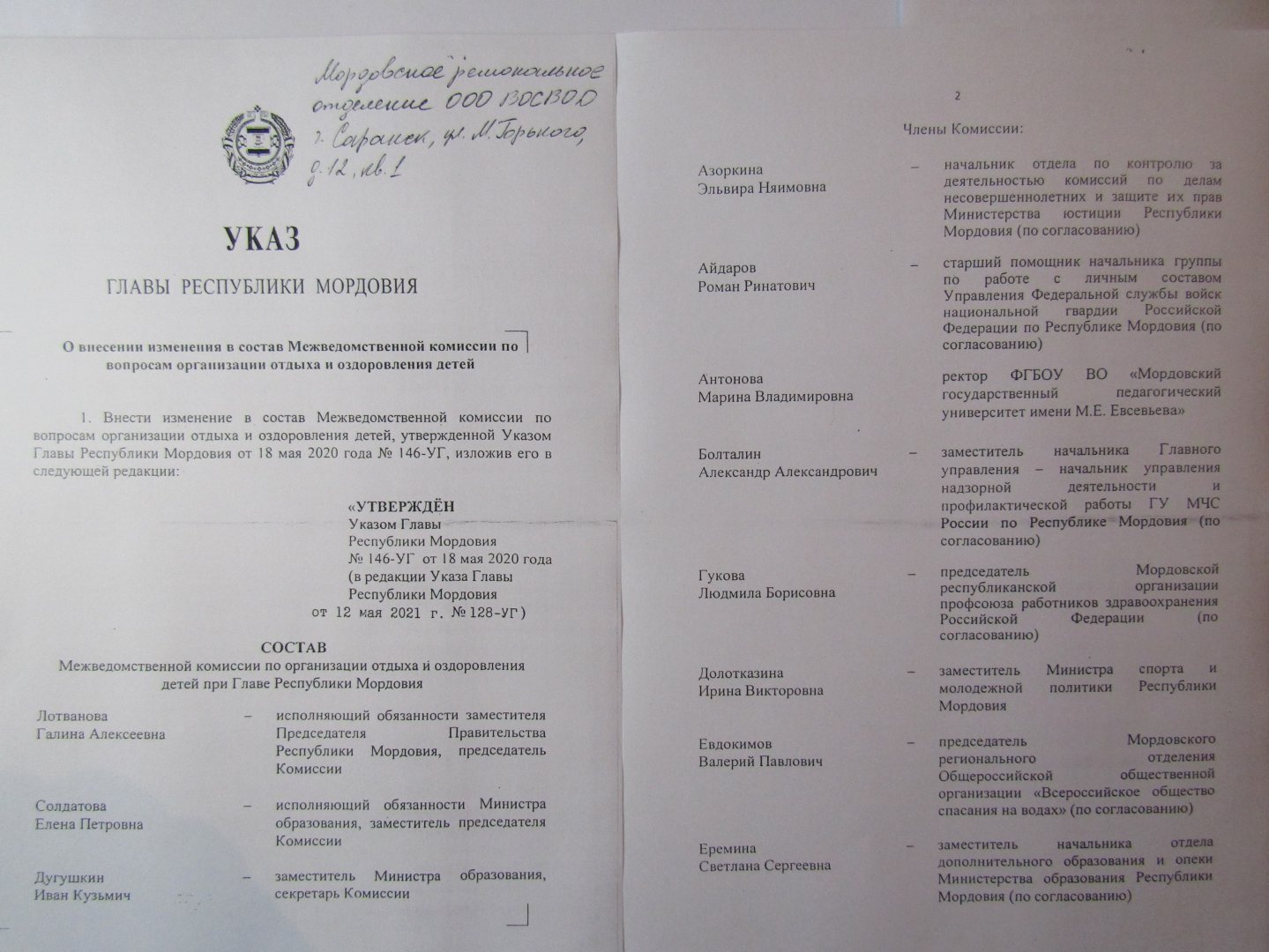 12 мая 2021 г. Врио Главы Республики Мордовия Здунов Артем Алексеевич подписал Указ за № 128-УГ «О внесении изменений в состав Межведомственной комиссии по вопросам организации отдыха и оздоровления детей». В состав Межведомственной комиссии по организации и оздоровления детей при Главе республики Мордовия, которую возглавляет исполняющий обязанности заместителя Председателя Правительства Республики Мордовия Лотванова Галина Алексеевна, был включен Председатель Мордовского регионального отделения Общероссийской общественной организации «Всероссийское общество спасания на водах» Евдокимов Валерий Павлович. В составе данной Комиссии Валерий Павлович отвечает за состояние водной составляющей отдыха в загородных детских оздоровительных лагерях, а также в санаториях, и других объектах отдыха, на базе которых будут работать детские оздоровительные лагеря. В течение ближайшего времени ему предстоит побывать во многих муниципальных районах республики, на территории которых расположены загородные оздоровительные лагеря и другие объекты отдыха, и проинспектировать, как руководители данных объектов подготовили места купания, плавательные бассейны, необходимый инвентарь и оборудование для организации занятий с детьми на воде, а также наличие подготовленных «Инструкторов по плаванию и спасанию на воде». Приложение: фото двух первых страниц текста Указа Врио Главы Республики Мордовия. Примечание: Данный Указ опубликован также в центральной газете республики «Известия Мордовии» за 14 мая 2021 года. Пресс-служба Мордовского регионального отделения ВОСВОД